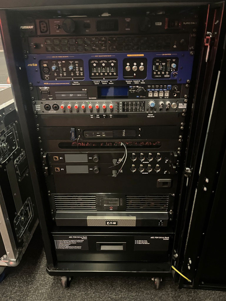 As part of the project, Novatech designed a custom drive rack centred around the L‑Acoustics P1 system processor. The system runs on fibre‑based AVB, with Cat5 AVB and analogue redundancy paths. The rack also incorporates an XTA MX36 console switcher, SSL interface, and a Stream Deck Studio with custom‑programmed controls.