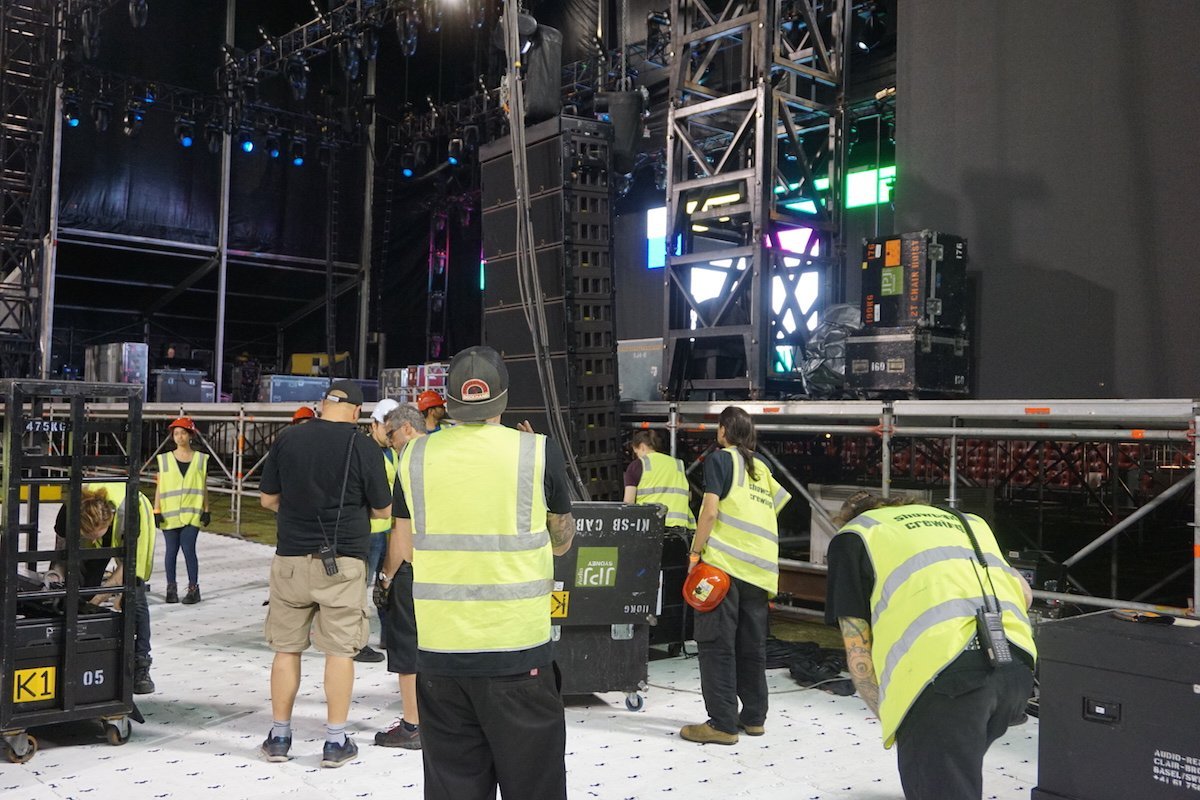 By 3pm the first semi-trailers of production gear come through the gates – some have travelled from the last gig in Mackay, others from Sydney – to be greeted by around 80 loaders supplied by Showcall. They’re a diverse collection of individuals (a lot more women than I expected) united by only two things – hi vis vests and an ability to quickly and efficiently follow the surprisingly basic and direct instructions: “Those trucks are full – let’s empty them.”