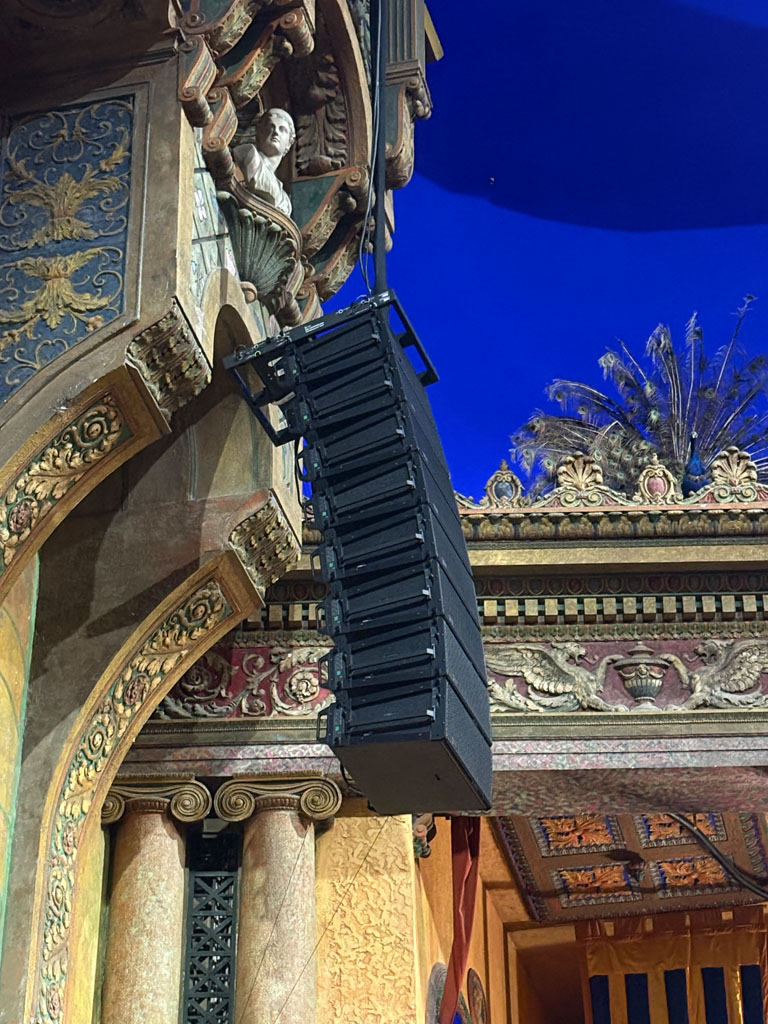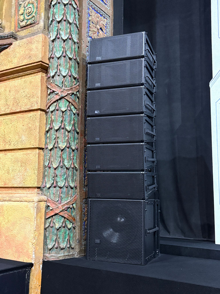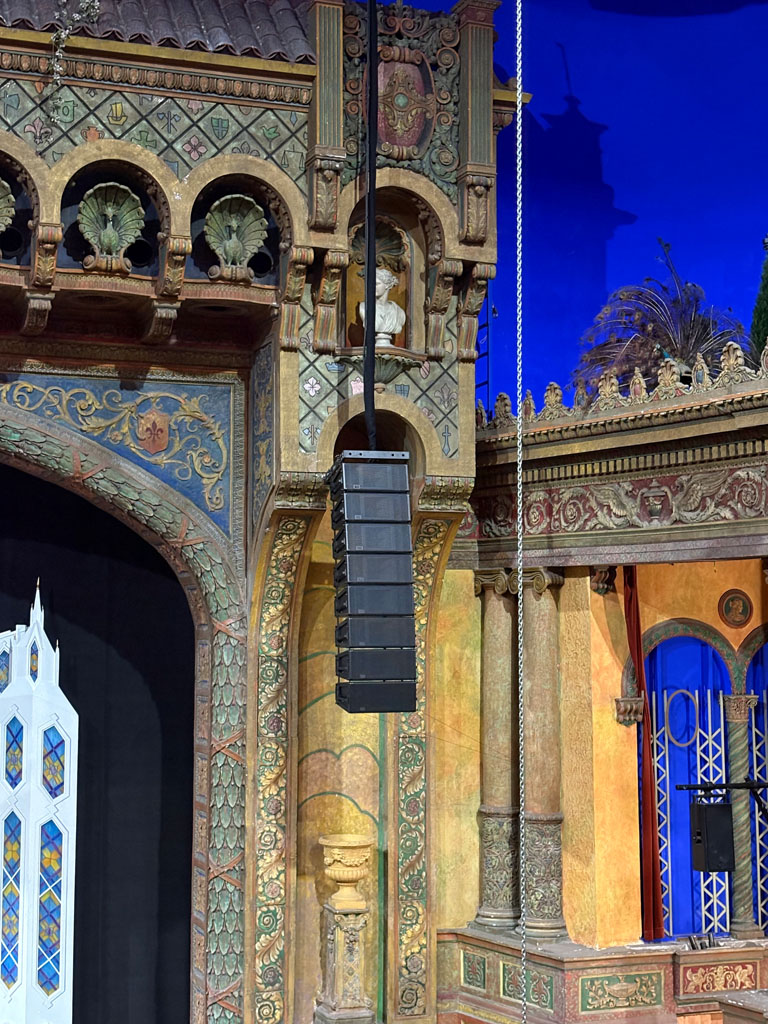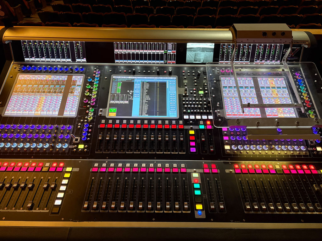 The main left-right PA is divided into two systems; one for the stalls, one for the circle. “That’s a real Brian Ronan hallmark,” adds David. The main PA hangs 14 Meyer Sound LEOPARD line array cabinets per side. 12 Meyer Sound LINA line array cabinets are used for the downfill, with another 10 in two delay arrays. A truss of eight Meyer Sound UPJ-1Ps is rigged for the back of the hall. Additional coverage includes 10 Meyer Sound UPJunior (six stage foldback, two sidefill, two utility), 12 Meyer Sound UPM-1P (six offstage, four fills, two utility), and four Meyer Sound UPA-1P for rear FX. Subs are two Meyer Sound 700-HP, four 900-LFC low-frequency control elements, and two 750-LFC low-frequency control elements, rigged alongside the delay LINA arrays. The whole system is processed through five Meyer Sound Galileo GALAXY processors.
