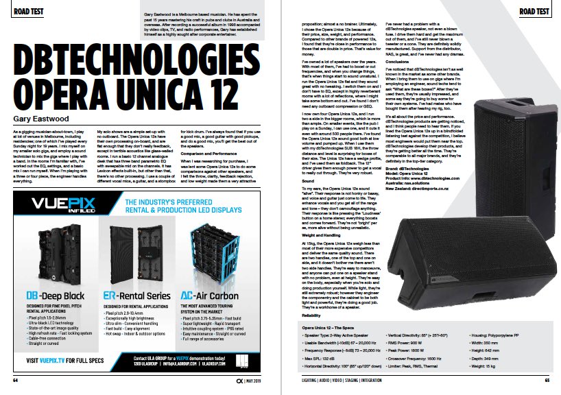 I’ve had mates who have bought them after hearing my rig, too. It’s all about the price and performance. dBTechnologies products are getting noticed, and I think people need to hear them. If you lined the Opera Unica 12s up in a blindfolded listening test against the competition, I believe most engineers would put them near the top.