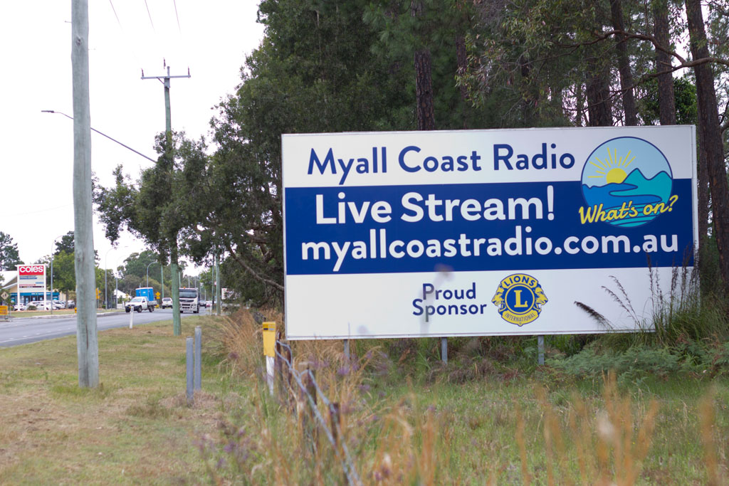 These special broadcasts were a boost to the Myall Lakes community, as the major commercial radio stations transmitting from Mount Sugarloaf, overlooking Lake Macquarie and Newcastle, were not only alienated from the Myall Coast and its services, but they also suffered major signal degradation, dropouts and distortion in the Myall Lakes area. Along with their services, Myall Coast Radio also supported the socially isolated individuals, those with medical or mobility issues or the loss of a partner. A joint initiative to read the local newspaper for the visually impaired was also part of the planning. The service was especially welcomed by the Tea Gardens and Hawks Nest communities, which have the oldest population profile in New South Wales and the entire nation and who traditionally tuned in to radio broadcasts, not smartphones or computer apps. Similarly, the mass of tourists entering the town, who were welcomed by the Myall Coast Radio 87.8 MHz billboard, could no longer tune their radios in for vital tourist and local weather information, including safe boating, swimming and fishing.