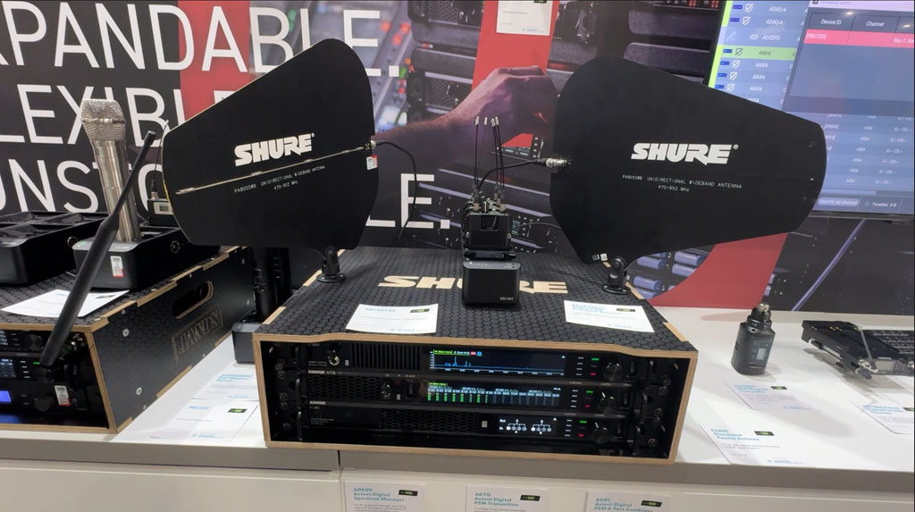 More from the WMAS RF revolution! Shure’s Axient Digital PSM: four transmitters, each capable of sending out four stereo channels. ShowLink remote control, networkable monitoring with Wireless Workbench, analog and digital (AES3, AES67, Dante) inputs, internal antenna combining, and CueMode, allowing engineers to easily monitor up to 64 encrypted stage mixes from a single ADXR bodypack.