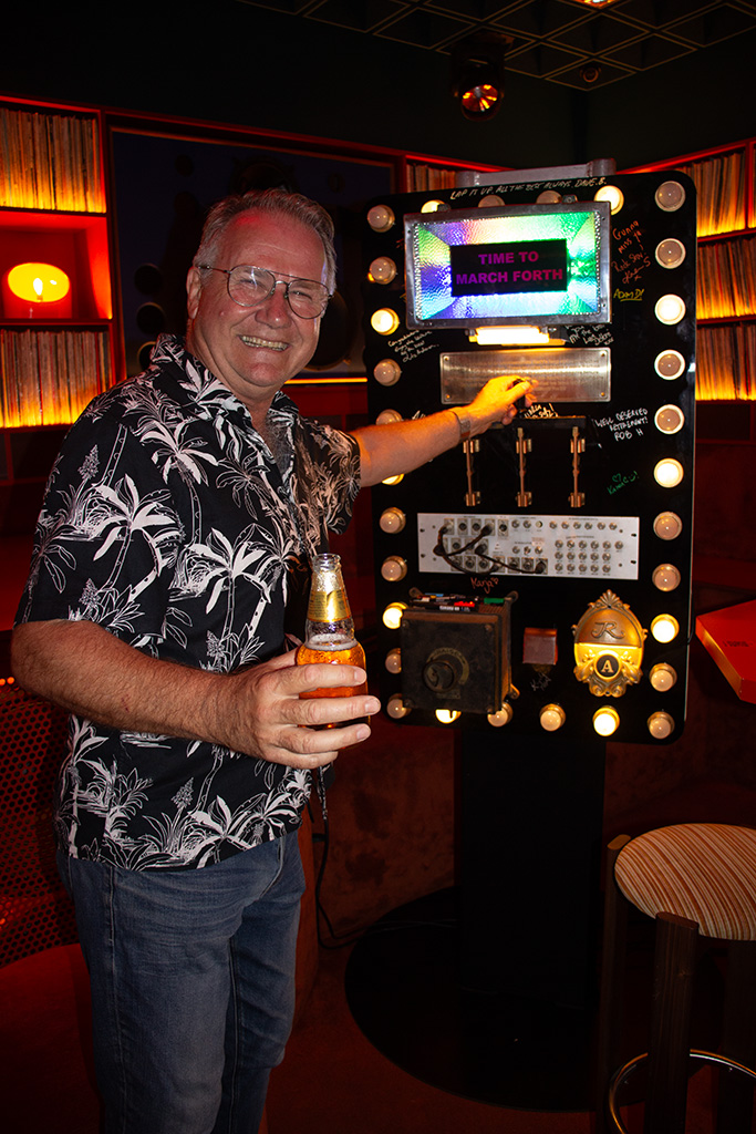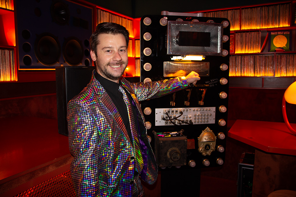 “This gift is comprised of different components from every venue that Marriner Group operates,” illustrates Robert. “We’ve got an old flood light from the chandelier of the Regent Theatre, a new Regent Theatre house light, an old knife switch from The Comedy, a patchbay from The Princess, a motor controller from The Forum, eye lights from the original Princess, and some chasing festoon on the outside, just to top it off. It was about 30 hours of design, fabrication and programming.”