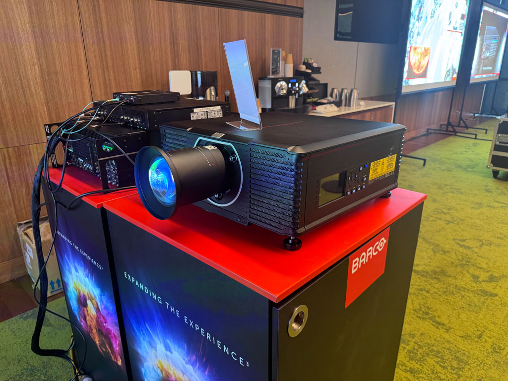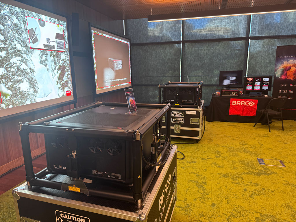 Barco commandeered the meeting room next door to Harman and offered both breakfast and lunch to those dropping in to see their new high-performance projectors and video processors. The star of the room was the new QDX range of projectors, with two units in their custom hydraulic housings taking up a serious amount of space.