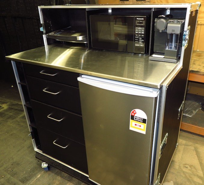 Even within the entertainment technology industry, requests vary. One recent project has been a roadcase for a mobile kitchen ordered by Norwest Oceania Productions for the lighting crew working on Dancing with the Stars, “They wanted a case to incorporate a fridge, Nespresso machine, microwave, toasted sandwich maker, storage and a stainless steel bench top.