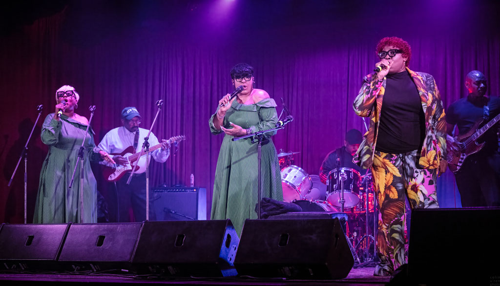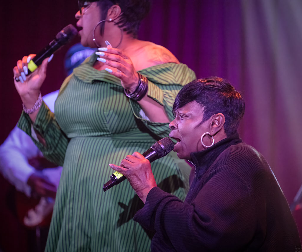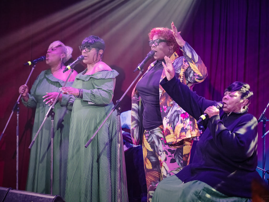 Before the show, we were forced to put tape on all four handhelds so that the women didn’t mix the mics up backstage, hence the tape clearly visible in the photos. Annie and the Caldwells typically start their shows instrumentally, with the guitar, bass, and drums of Willie Joe Caldwell, Sr. (guitar), Willie Caldwell Jr. (bass), and Abel Caldwell (drums) kicking things off, the ladies then singing while they’re still backstage – hence the need for the mics to be labelled.