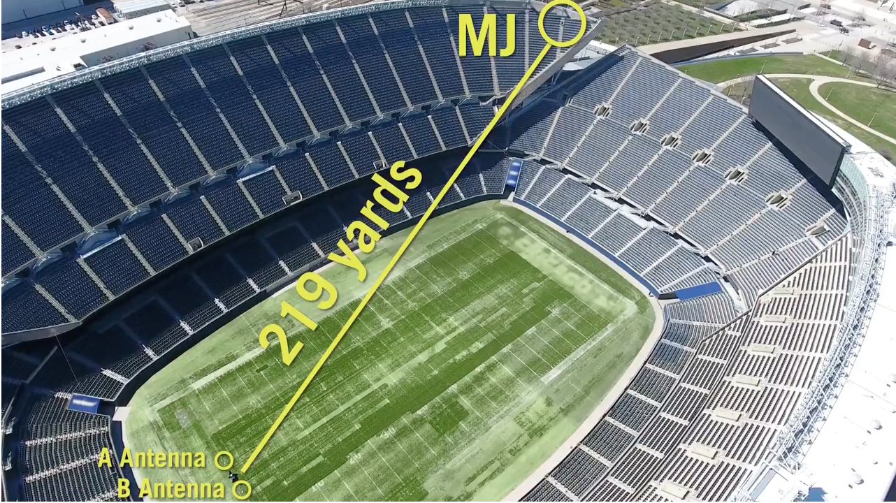 The video demo shows a guy up top of the furthest stand at the field, 220 yards from the receiver. He has a belt pack behind him, without line of sight. His signal strength is 3 of a possible 5, using HD.