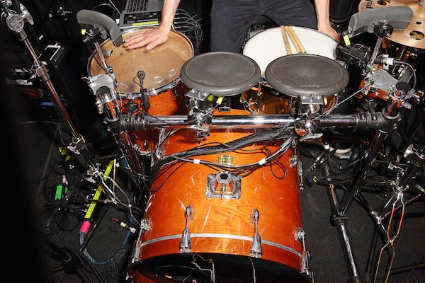 The drum kit setup is a hybrid rig comprised of Yamaha oak custom shells, an acrylic snare (made by local Sydney company Blackbird Drums), a Gibraltar rack with Roland PD8 & BT1 triggers, KT-10 kick pedal trigger, and an RT-30k kick trigger on the acoustic kick. This all runs into a ROLAND TMC-6 trigger to midi converter before hitting the Ableton rig where all the samples are triggered from drum racks in the master session.