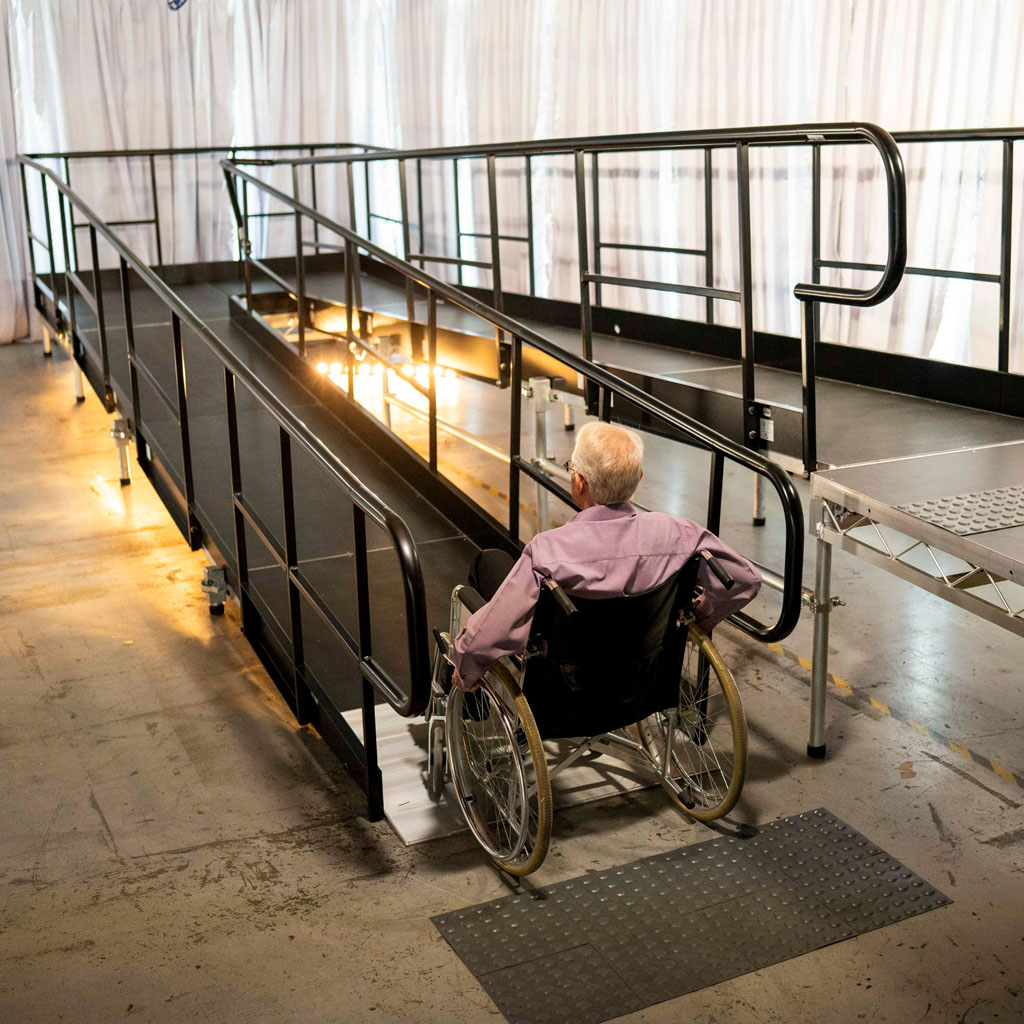 Built with durable staging platforms, the ramp features a 1:14 incline for safe, inclusive access. Its modular design allows left-turn, right-turn, and wraparound configurations, including mid-height landing platforms, while remaining fully compatible with standard stage decks.