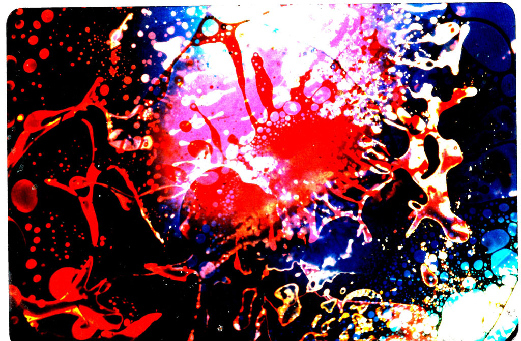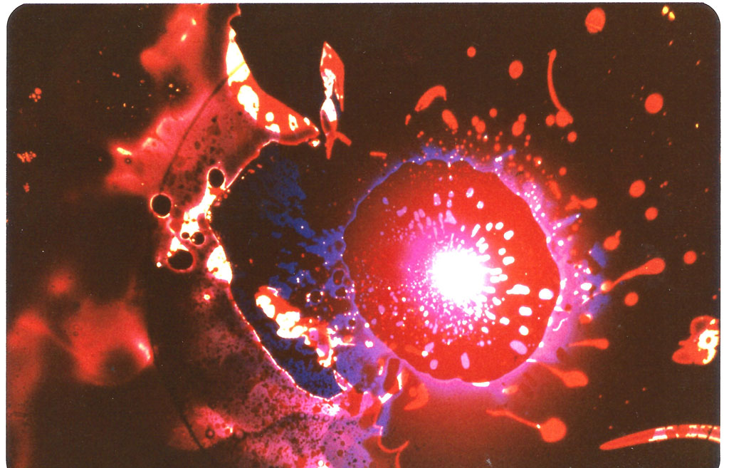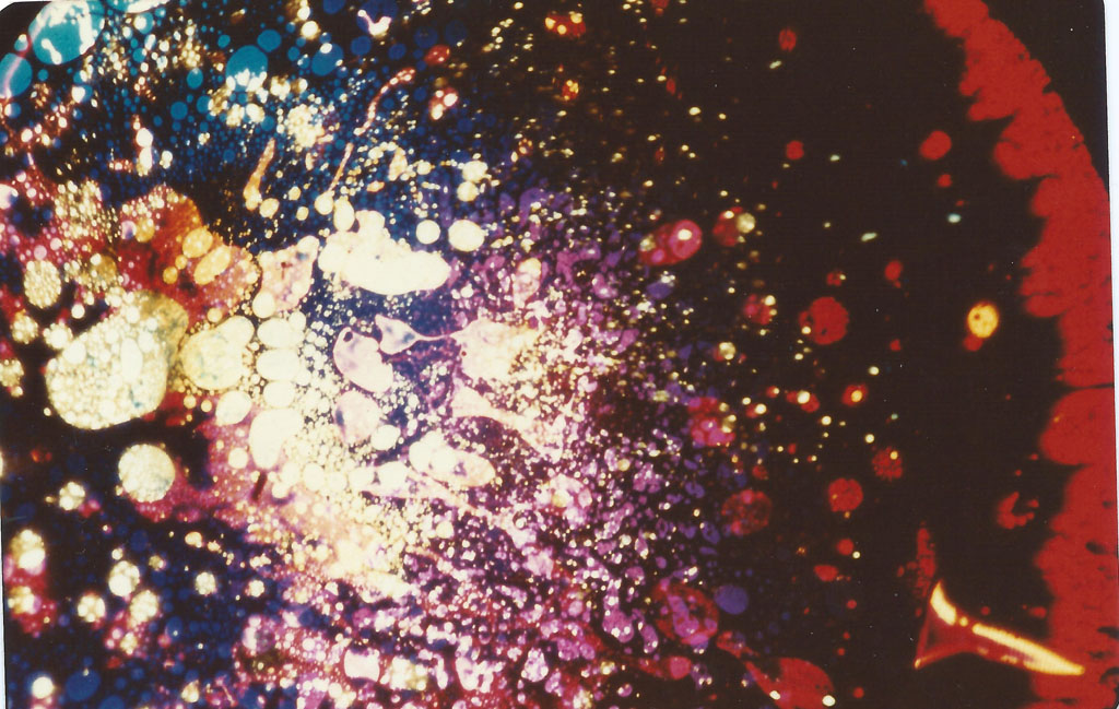 On a scaffold platform, Batchelor and several hippies, usually in a chemically altered state, operated overhead projectors using paired Pyrex dishes filled with water- and oil-based dyes. Moving the dishes produced swirling colour patterns, ideally in time with the music.