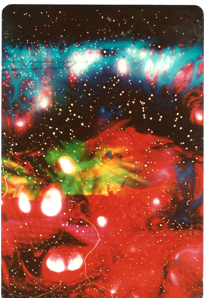 On a scaffold platform, Batchelor and several hippies, usually in a chemically altered state, operated overhead projectors using paired Pyrex dishes filled with water- and oil-based dyes. Moving the dishes produced swirling colour patterns, ideally in time with the music.