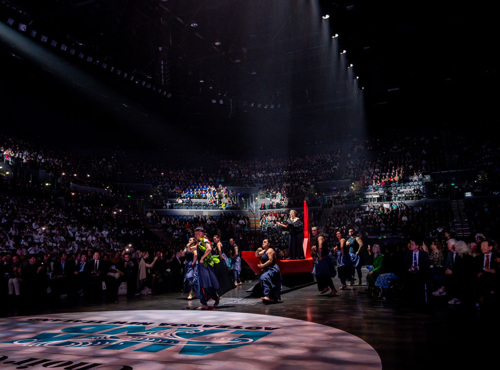 Pak’s planning for the opening ceremony began with the footprint required for the opening, closing and four award ceremonies, all to be held at Spark Arena. The space needed for a 600-person choir, the Auckland Philharmonia, plus front of stage singers, dancers and presenters pushed the Spark Arena to its limits. Pak recalls, “We went through three iterations to identify the most financially efficient solution, ultimately using the bleachers and pushing the stage forward with creative use of stage risers by Stage NZ to give the appearance that the choir was on one seamless platform.”